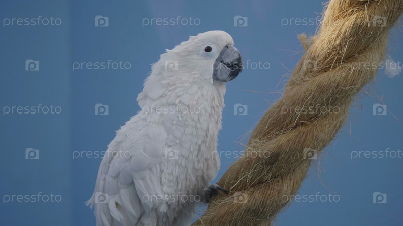 Большой белый попугай Какаду лат. Какатуиды ползают по веревке