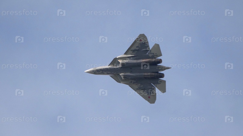 Москва, Россия, Аэродром Жуковский, 25 июля 2021 года: Демонстрация новейшего российского истребителя Су-57 на международном аэрокосмическом салоне МАКС-2021