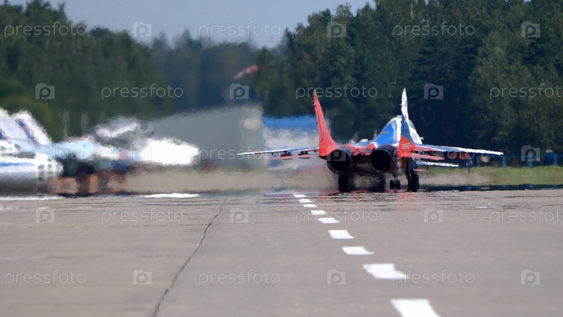 Москва Россия Аэродром Жуковский 25 июля 2021 года: пилотажная группа МиГ-29 выполняет демонстрационный полет международного аэрокосмического салона МАКС-2021