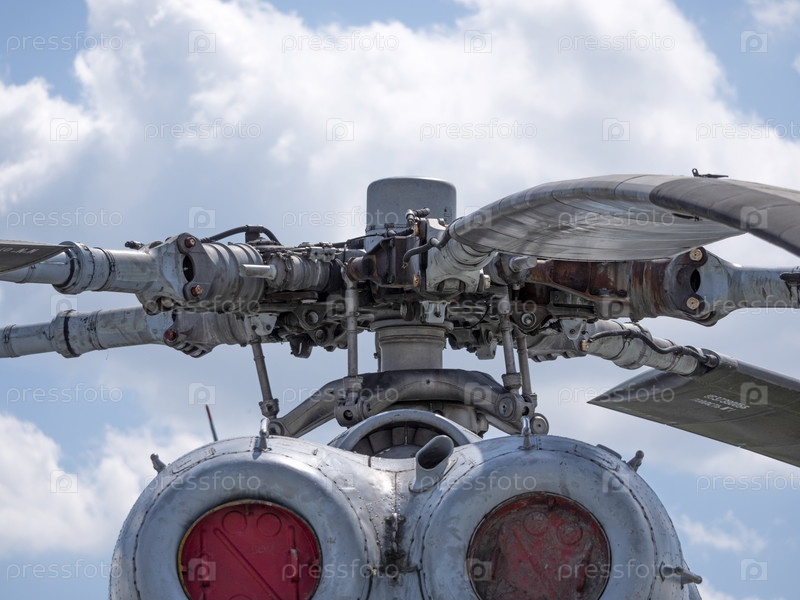 Механизм соосных винтов военного вертолета на фоне голубого неба, крупный план