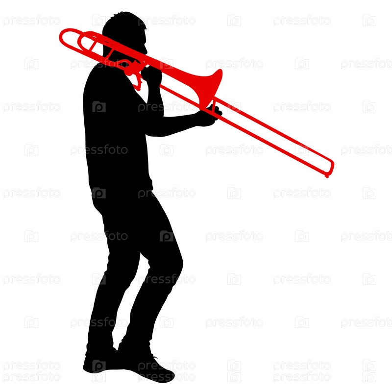 Силуэт музыканта, играющего на тромбоне на белом фоне