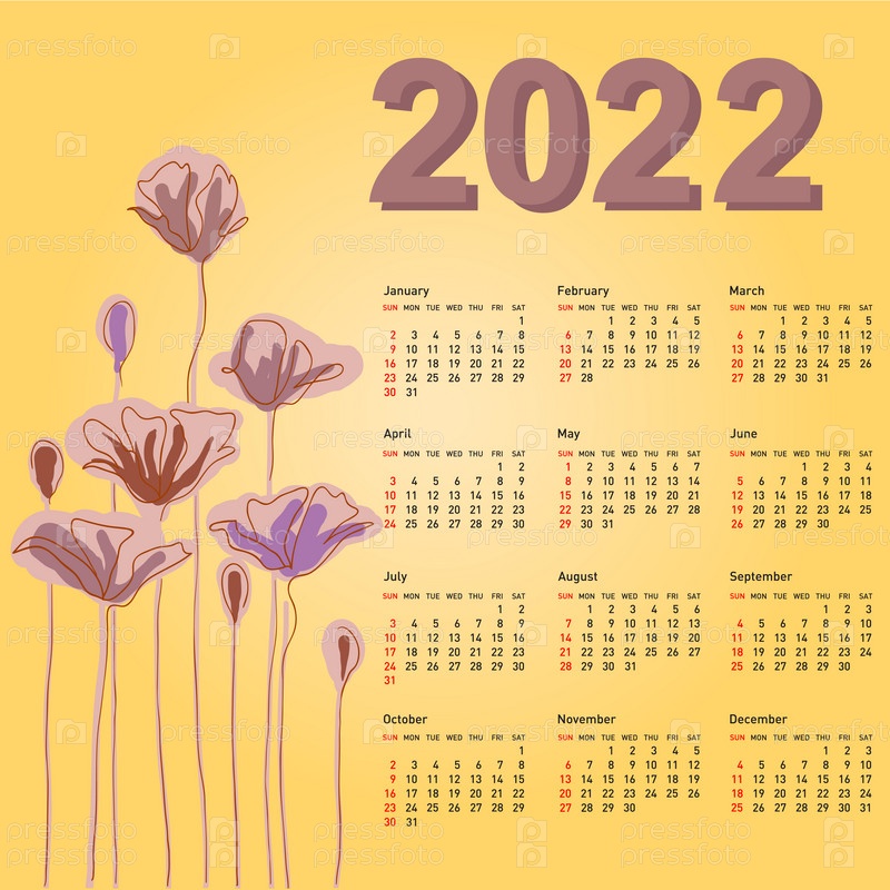 Стильный календарь с цветами на 2022 год. Неделя начинается в воскресенье