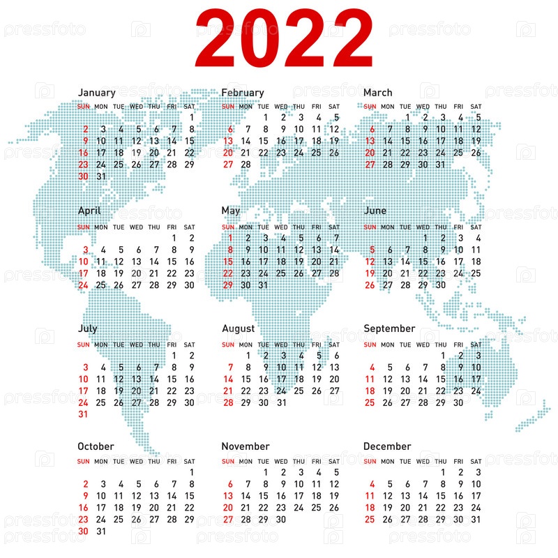 Календарь 2022 года с картой мира. Неделя начинается в воскресенье