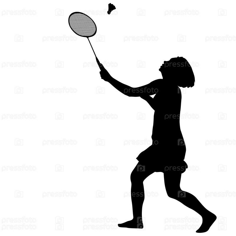Черный силуэт бадминтонистки на белом фоне