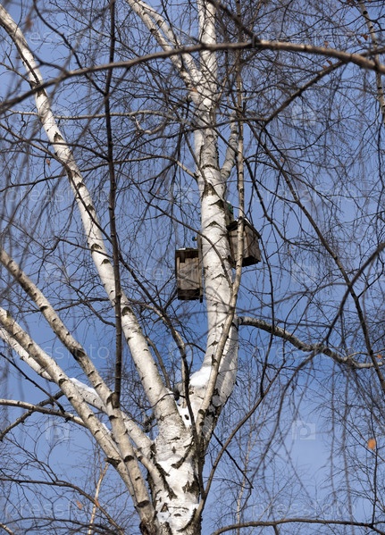 Зимний березовый лес в солнечном свете на фоне голубого неба