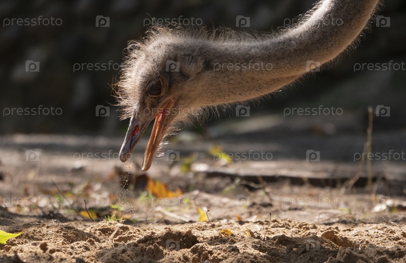 Страус крупным планом в песке в поисках еды
