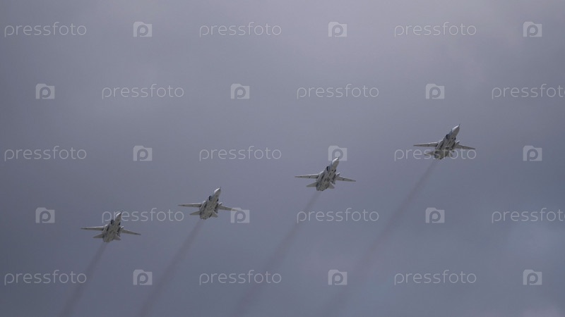 МОСКВА, РОССИЯ - 7 мая 2021 года: Авиапарад в Москве. реактивный истребитель Су-24 в небе на параде Победы во Второй мировой войне в Москве, Россия