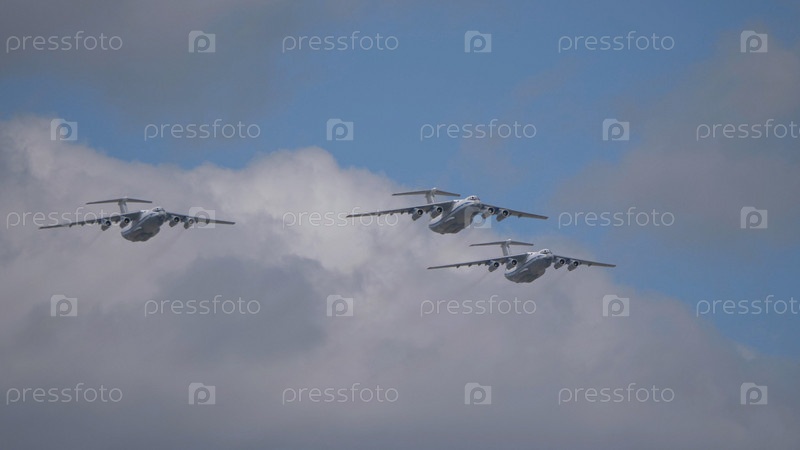 МОСКВА, РОССИЯ - 7 мая 2021 года: Авиапарад в Москве. 3 многоцелевых четырехмоторных стратегических авиалайнера Ил-76 летают в небе на параде Победы во Второй мировой войне в Москве, Россия
