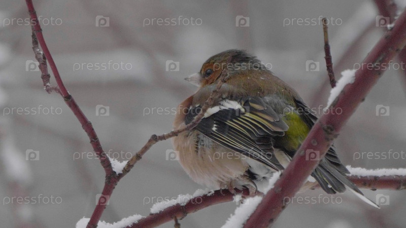 Птицы под Москвой, желтая овсянка на ветке дерева