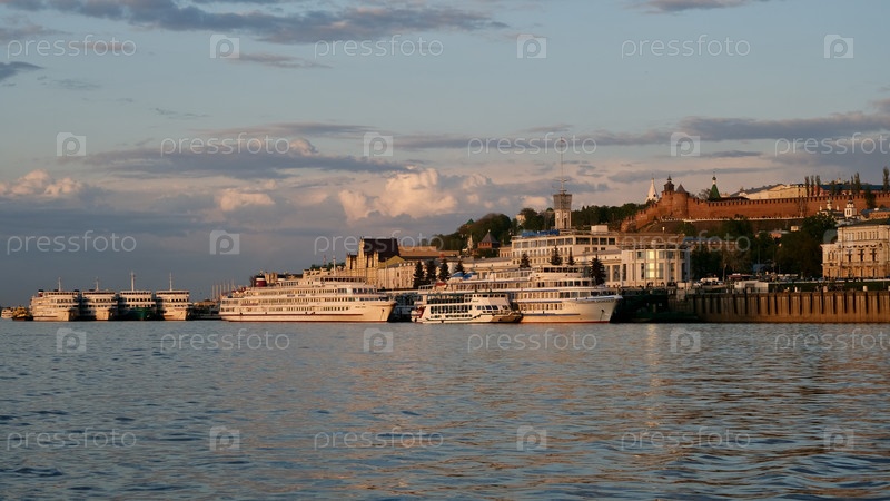 Вид на Нижегородский кремль с воды. Весна, май, закат. Вид на историческую часть города с палубы туристического прогулочного теплохода. Нижний Новгород