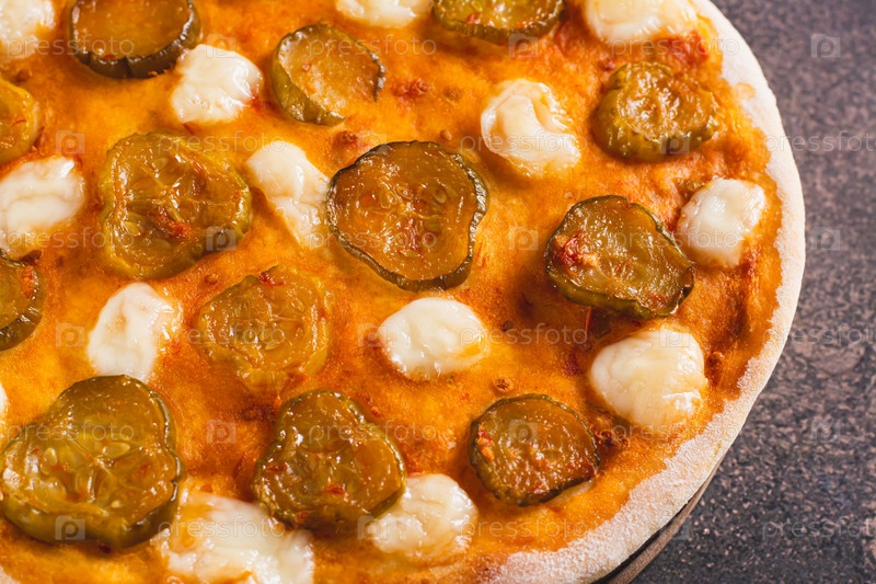 Крупным планом острая пицца с сыром и солеными огурцами на деревянной доске на столе