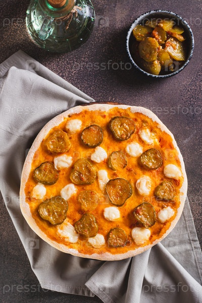 Острая пицца с сыром и солеными огурцами на деревянной доске на столе и вертикальный вид