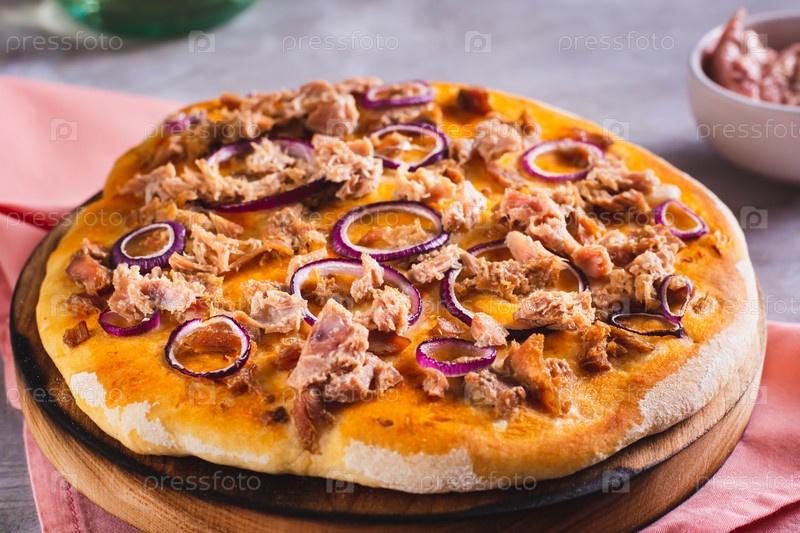 Домашняя пицца с консервированным тунцом и красным луком на деревянной доске