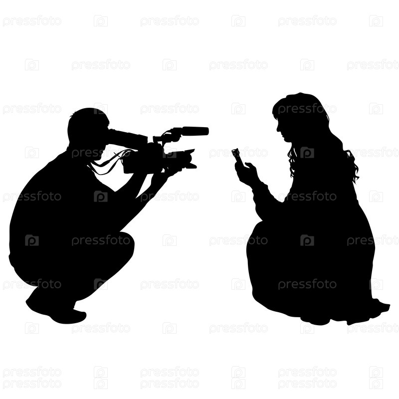 Оператор силуэта удаляет журналиста с микрофоном на белом фоне