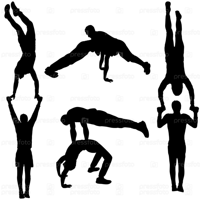 Набор акробатов в разных позициях силуэта на белом фоне