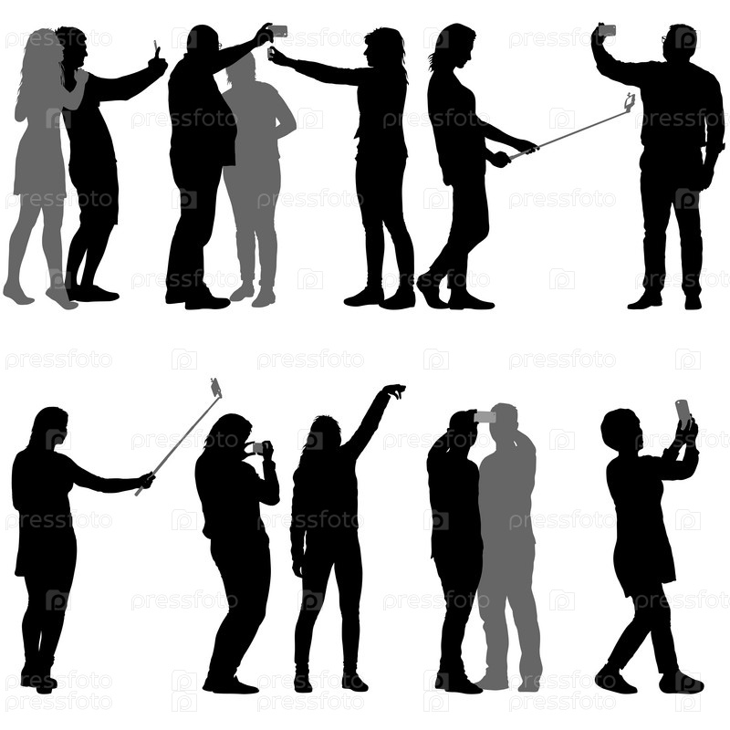 Установите силуэты мужчины и женщины, делающих селфи со смартфоном на белом фоне