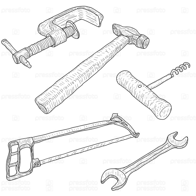 Установите ручной инструмент эскиза силуэта на белом фоне