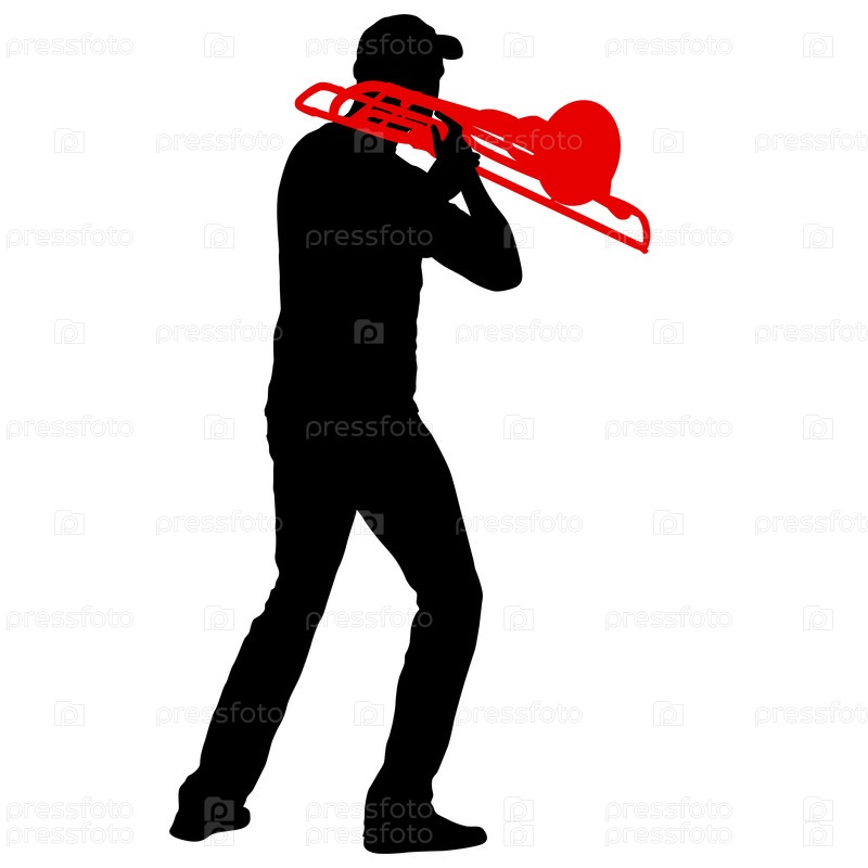 Силуэт музыканта, играющего на тромбоне на белом фоне