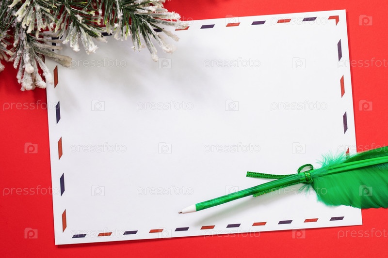 Пустой конверт, еловая ветка и перо на красном фоне, шаблон для дизайнера на тему писем Деду Морозу