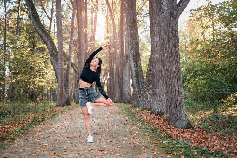Женщина, практикующая йогу, выполняет вариацию упражнения врикшасана, позу дерева, тренируется одна в повседневной одежде в солнечный осенний день в парке, стоя на дорожке