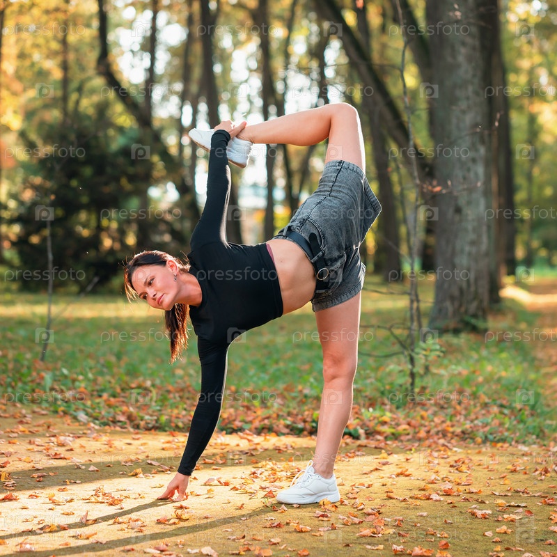 Женщина, практикующая йогу, выполняет вариацию упражнения Ардха Чандрасана, позу полумесяца, тренируется, стоя в солнечный теплый осенний день в парке