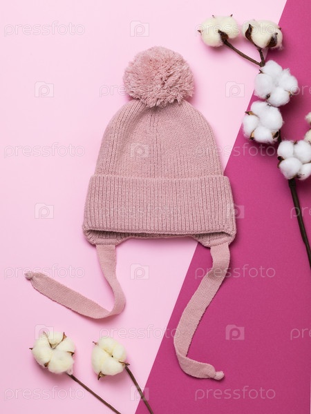 Детская вязаная шапка и декоративные хлопковые ветки на цветном фоне, вид сверху