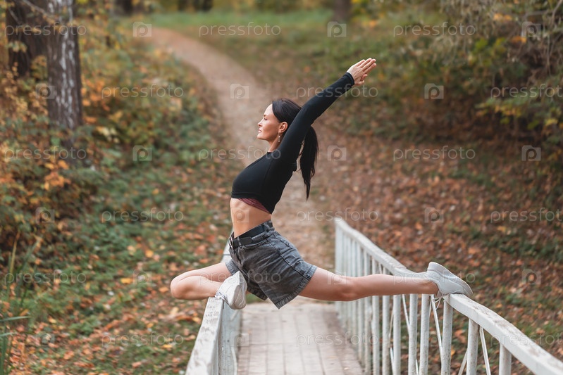 Женщина, практикующая йогу, выполняет вариацию упражнения Эка Пада Раджакапотасана, поза голубя, тренируется, сидя на перилах деревянного моста, в осенний день в парке