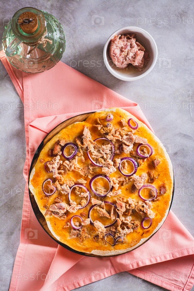 Консервированный тунец и лук в запеченной пицце на деревянной доске на столе и вертикальный вид