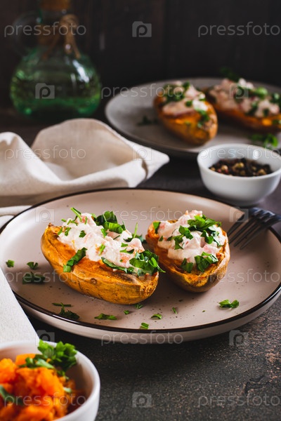 Запеченный сладкий картофель, фаршированный рикоттой, помидорами и зеленью на тарелке, вертикальный вид