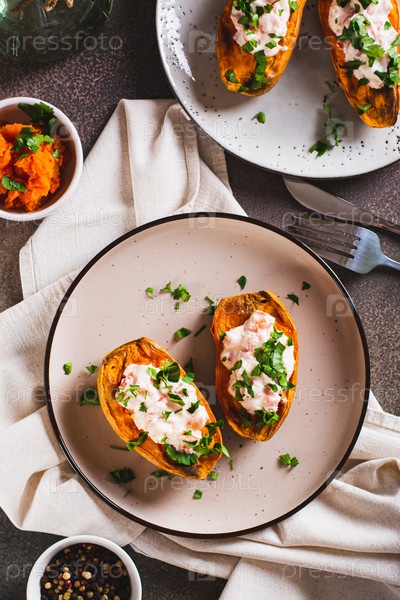 Запеченный сладкий картофель с начинкой из рикотты, помидоров и петрушки на тарелке и вертикальный вид