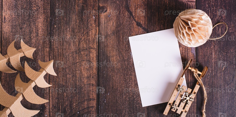 Список пожеланий для веб-баннера с Санта-Клаусом, санями, картонной елкой и самодельным шаром, вид сверху