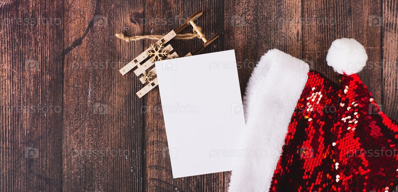 Список подарков с шапкой Санта-Клауса, картонными елками и санями на веб-баннере с видом на стол