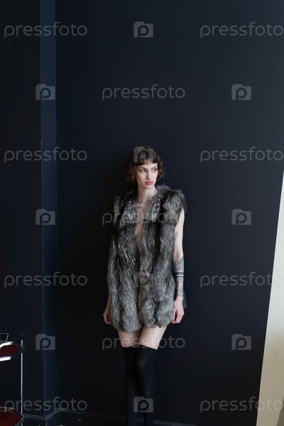 Молодая красивая женщина позирует в шубе в студии