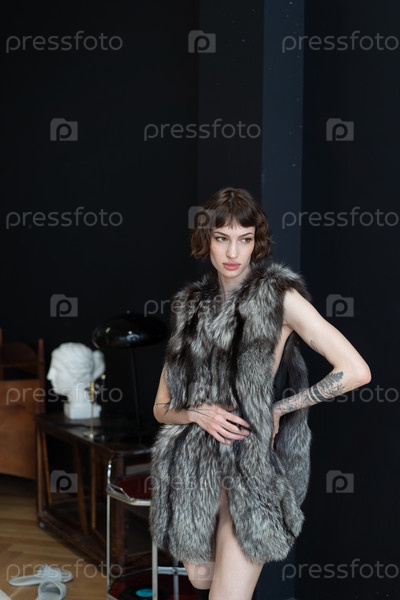 Молодая красивая женщина позирует в шубе в студии