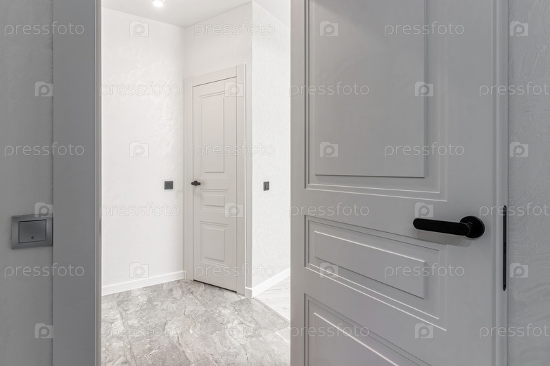 Белый современный интерьер в новой квартире, белые межкомнатные двери