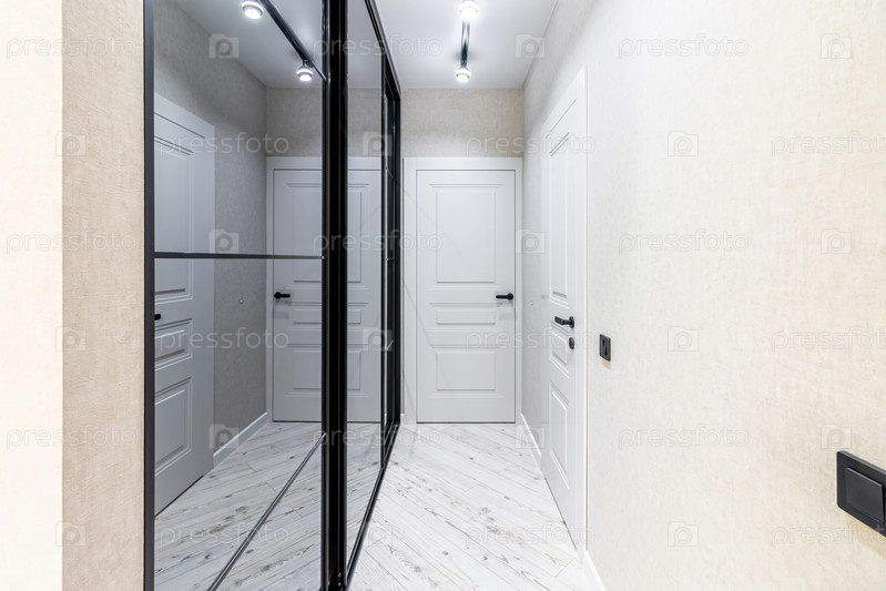 Белый современный интерьер в новой квартире, белые межкомнатные двери