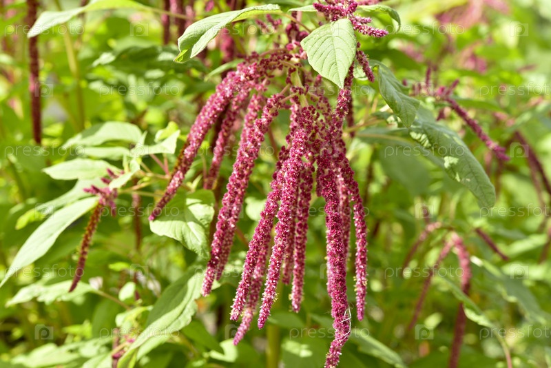 Красные цветы амаранта на зеленом кусте. Цветы крупным планом