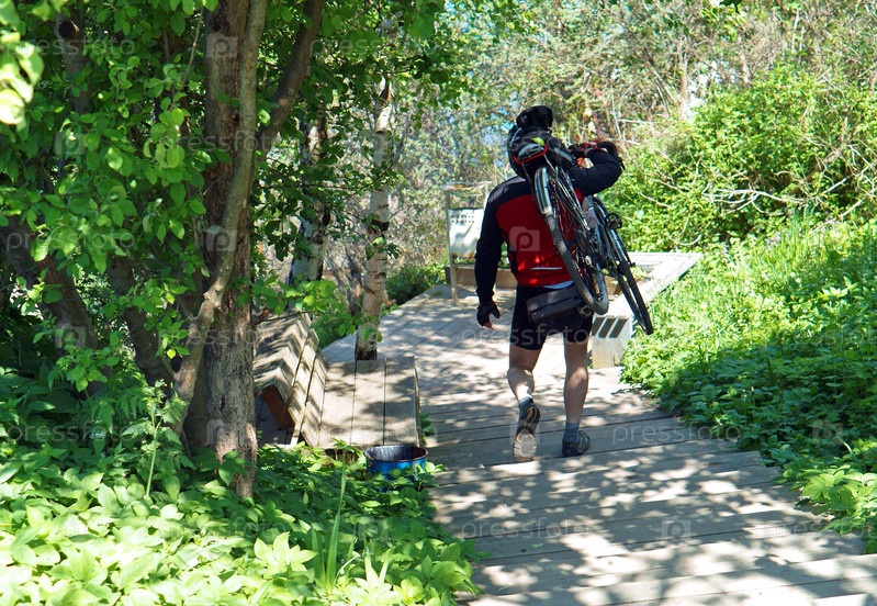 Мужчина несет велосипед вверх по лестнице, спортсмен сбивает велосипед с лестницы