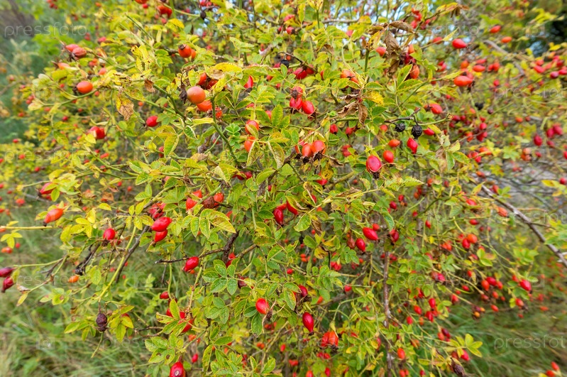Красные ягоды шиповника. Лекарственные ягоды. Дикая роза. Бедренный куст