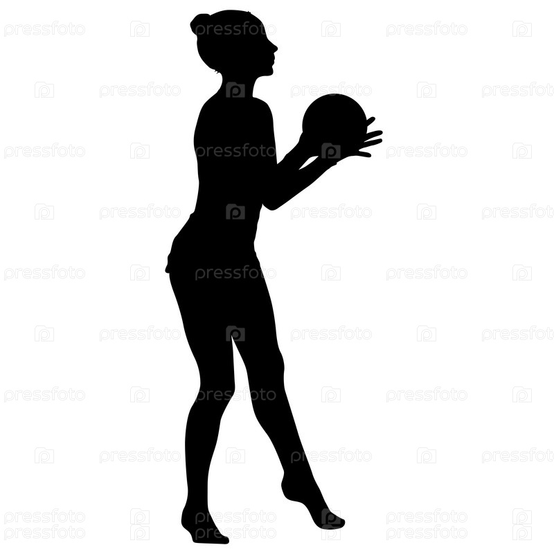 Силуэт девушки-гимнастки с мячом на белом фоне