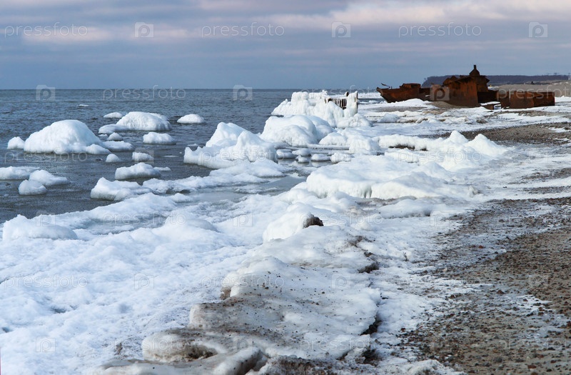 Море замерзло, пробито льдом, морское побережье во льду зима на балтийском море, гололедица на набережной