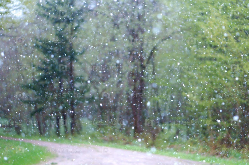 Весной в лесу идет снег, зеленые деревья и снежная погода