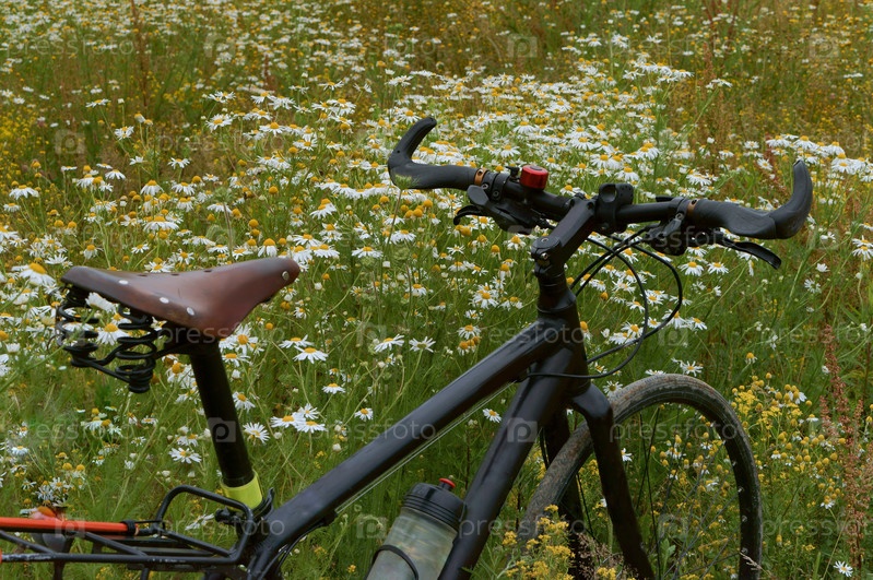 Велосипед в поле ромашек, черный велосипед на поляне ромашек
