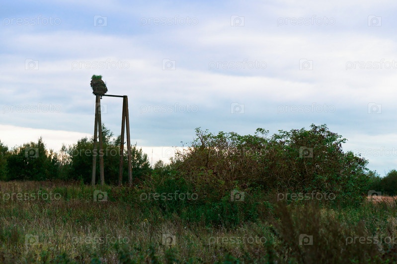 Аистовое гнездо из электропроводов, столбов, за городом, скрутки