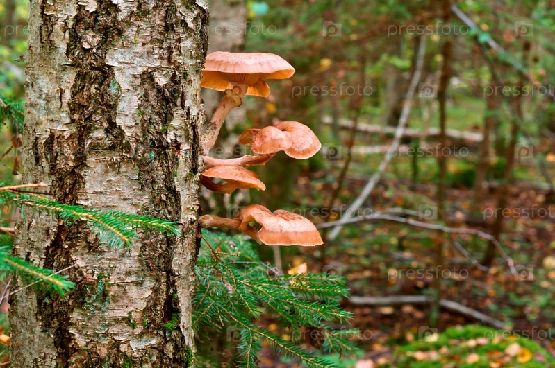 Большие грибы опята растущие на дереве, грибы на березе в лесу