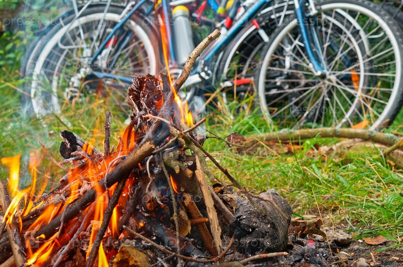 Велосипедисты туристы устроили костер, поездка на велосипеде