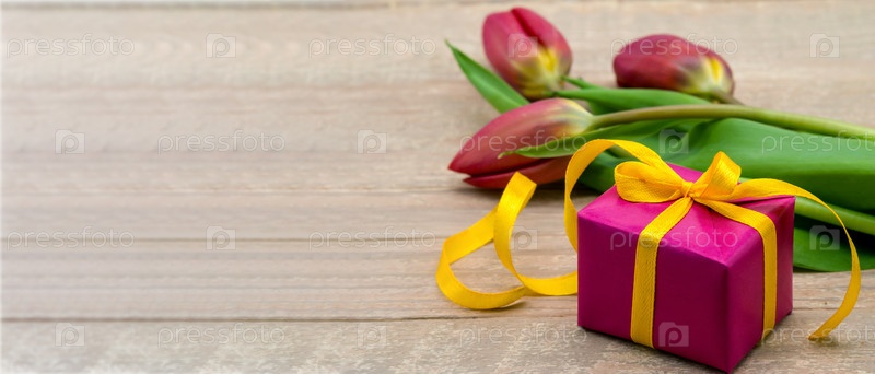 Подарок и тюльпаны на деревянном фоне. Весенние цветы и подарочная коробка