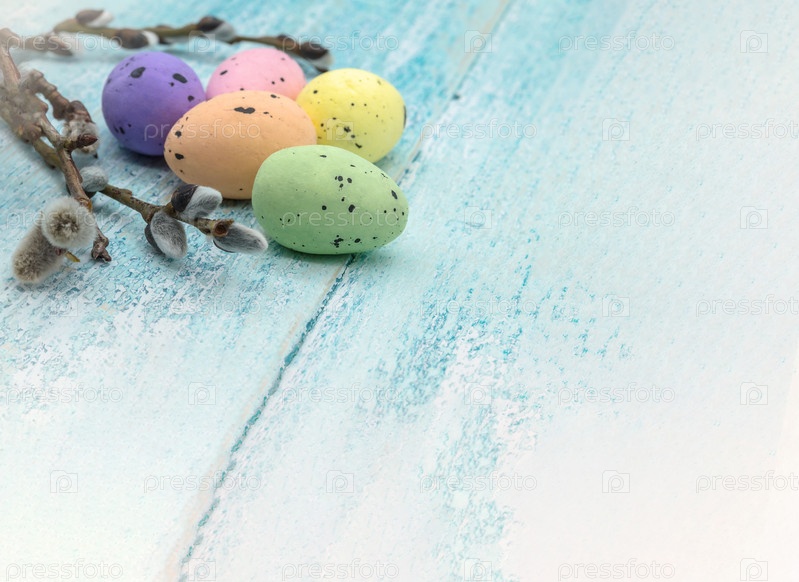 Веточки ивы. Пасхальные яйца. Христос воскрес. Синий фон