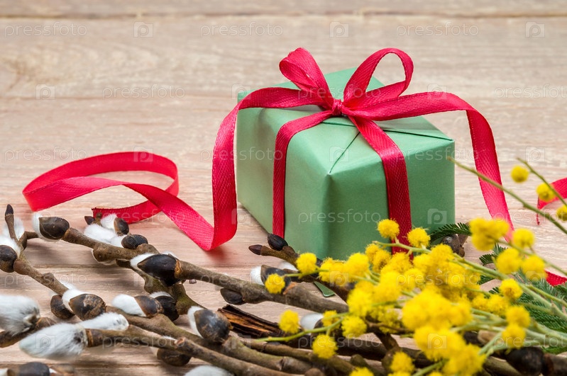 Желтая мимоза и пушистая ива. Подарок на деревянном фоне