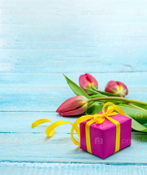 Весенние цветы и подарочная коробка. Красные тюльпаны и красная упаковка